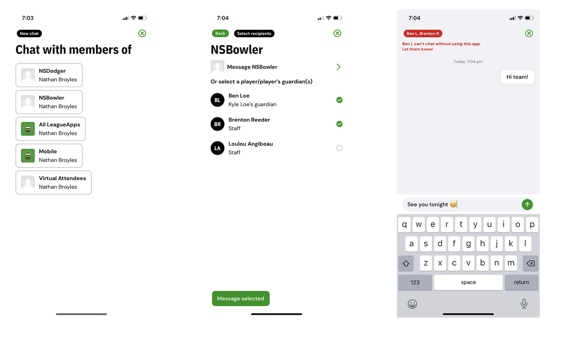 In the Chat tab, you are able to click the ➕ sign in the top right corner to chat message with the whole team as well as individuals on the team, including staff and parents.