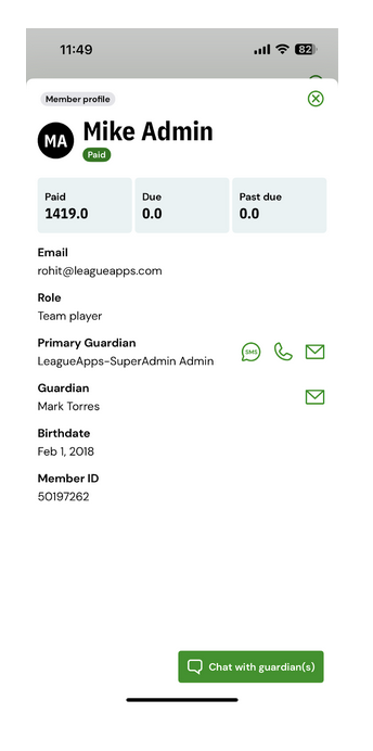 From the roster, you can contact a player directly by clicking on the name and then choose the desired communication and included method [Call, Chat, or Email.]