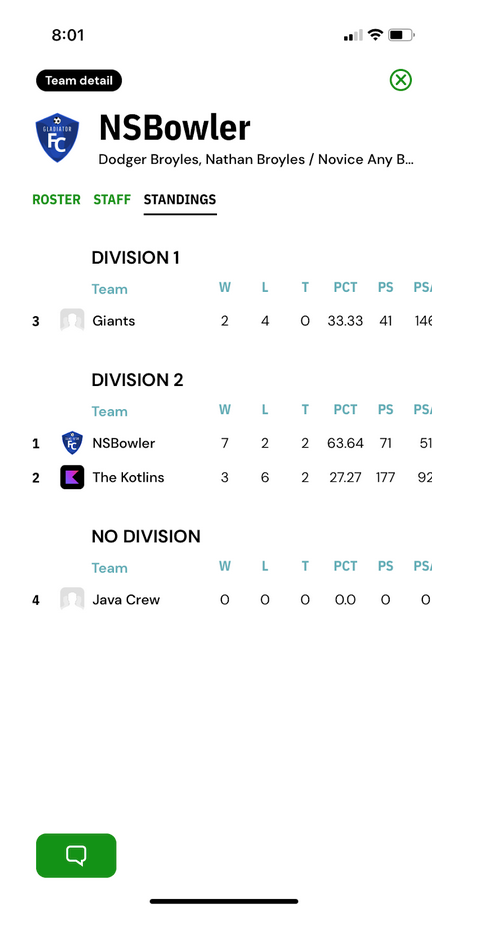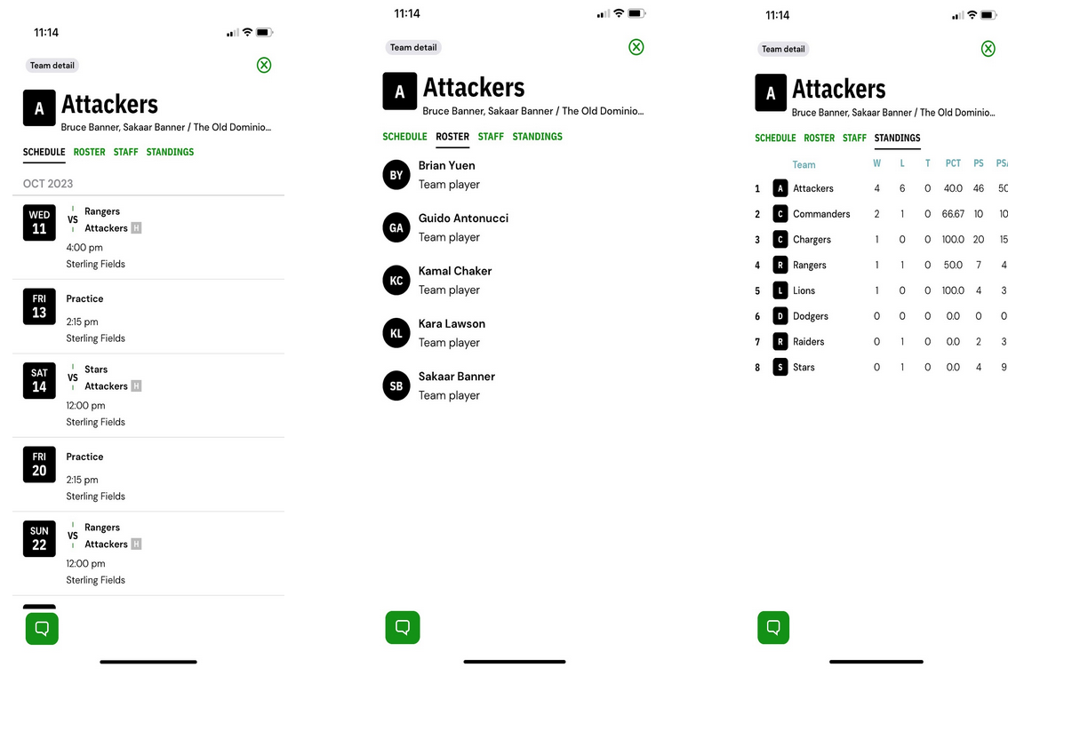 If you tap on a team shown in your schedule, you are able to view the Team details page, which includes the Team Schedule, Roster, Staff, and Standings.