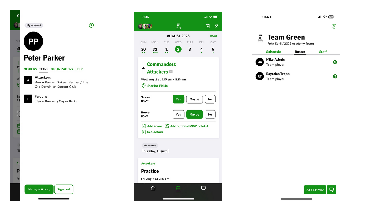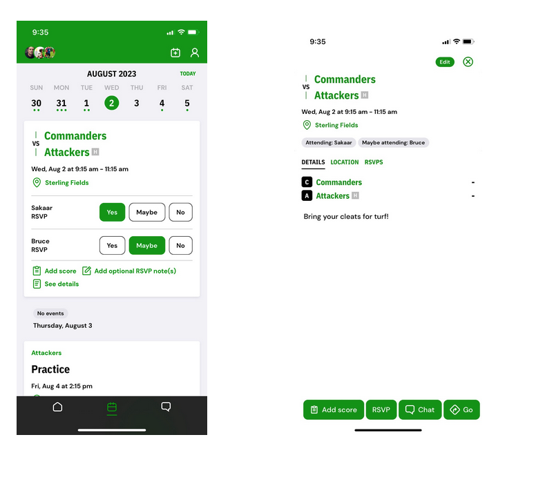RSVP to share your availability for practices, games or any team events in the Schedule Calendar. From a calendar event click the RSVP icons to submit your response. You can tap any event to see the event details, location, and RSVP.